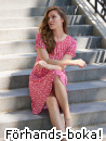 Mycket smickrande modell med avskärning i midjan och med lagda veck som ger vidd i kjolen.