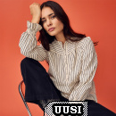 Blusen har ok i tvärgående ränder, ståkant i halsen knäppning med klädda knappar, lätt...